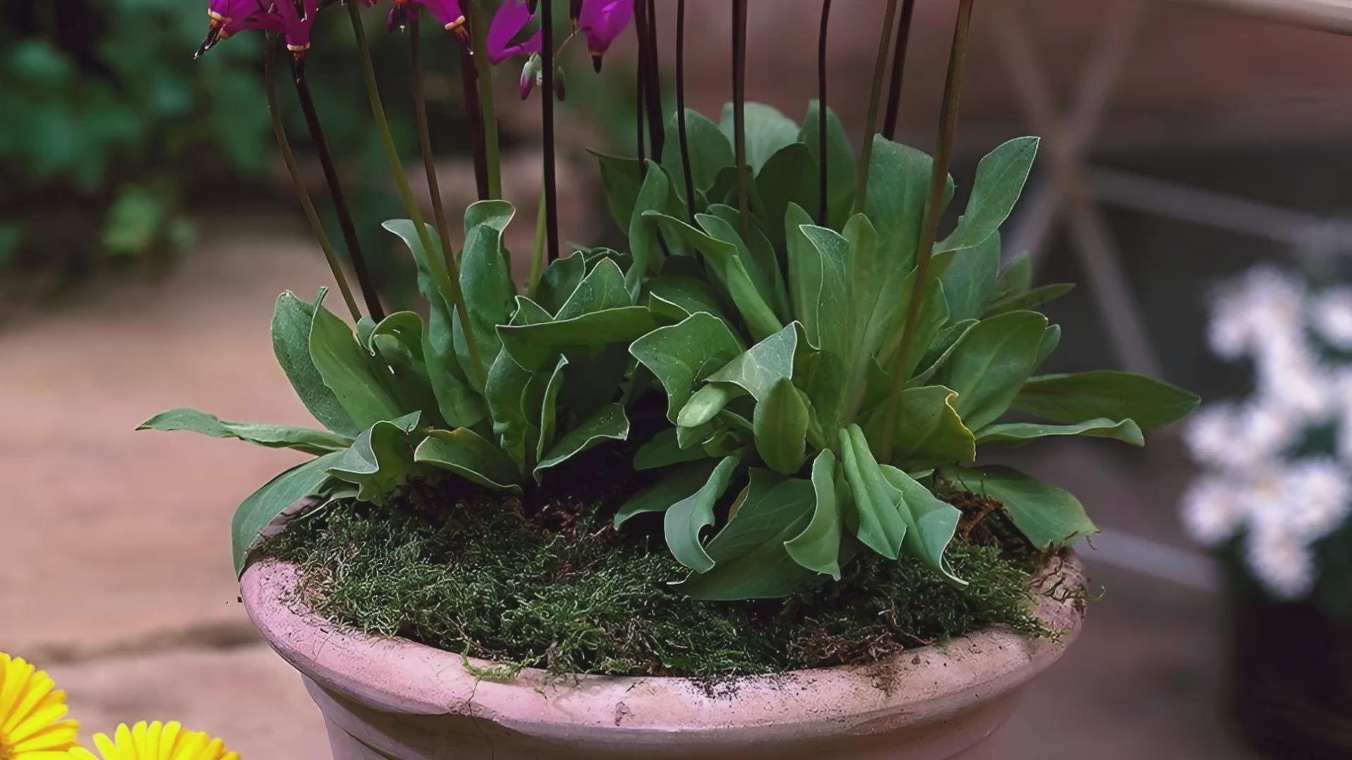 Dodecatheon meadia ist eine Frühjahrsblüherin, die nach der Blüte ihr Laub einzieht und in die Ruhephase übergeht.