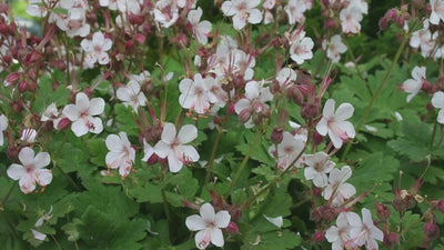 Geranium macrorrhizum 'Spessart' ist eine winterharte, mehrjährige Staude, die mit ihren zarten weißen Blüten und ihrem aromatischen Laub eine besondere Bereicherung für Beete, Gehölzränder und Steingärten darstellt. Die schalenförmigen Blüten mit einem zarten rosafarbenen Hauch erscheinen von Mai bis Juli und bieten eine wertvolle Nahrungsquelle für Bienen und Schmetterlinge.